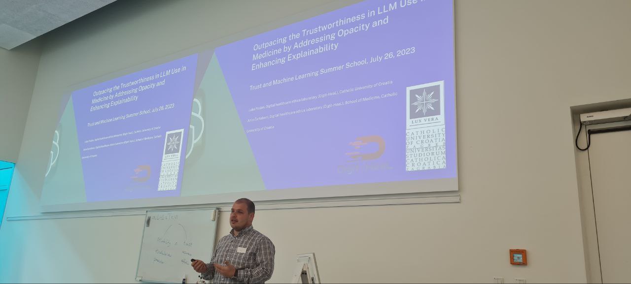 Naš doktorand iz Laboratorija za etiku digitalnih tehnologija u zdravstvu (Digit-HeaL) Luka Poslon sudjelovao je na ljetnoj školi Trust and Machine Learning koja se održala od 26. do 28. srpnja 2023. u Stuttgartu. Ljetna škola je održana u organizaciji High-Performance Computing Center (HLRS) pri Sveučilištu u Stuttgartu. Tema ljetne škole bila je vezana uz povjerenje u metode umjetne inteligencije koje su se našle u središtu pozornosti zbog nedavnih relevantnih tehnoloških dostignuća poput ChatGPT-a, autonomnih vozila i prometnih nesreće koje su prouzročili te zbog nedostatka pravne regulacije u gorućim pitanjima koje se tiču umjetne inteligencije. Povjerenje zauzima ključnu ulogu pri procjeni mogućih posljedica u modelima strojnog učenja (machine learning).