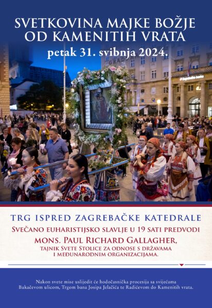 Na svetkovinu Majke Božje od Kamenitih vrata, zaštitnice grada Zagreba, u petak 31. svibnja 2024. godine, svečano misno slavlje u 19 sati ispred zagrebačke prvostolnice predvodit će nadbiskup mons. Paul Richard Gallagher, tajnik Svete Stolice za odnose s državama i međunarodnim organizacijama. Nakon svete mise uslijedit će hodočasnička promocija sa svijećama Bukačevom ulicom, Trgom Bana Josipa Jelačića te Radićevom ulicom do Kamenitih vrata.