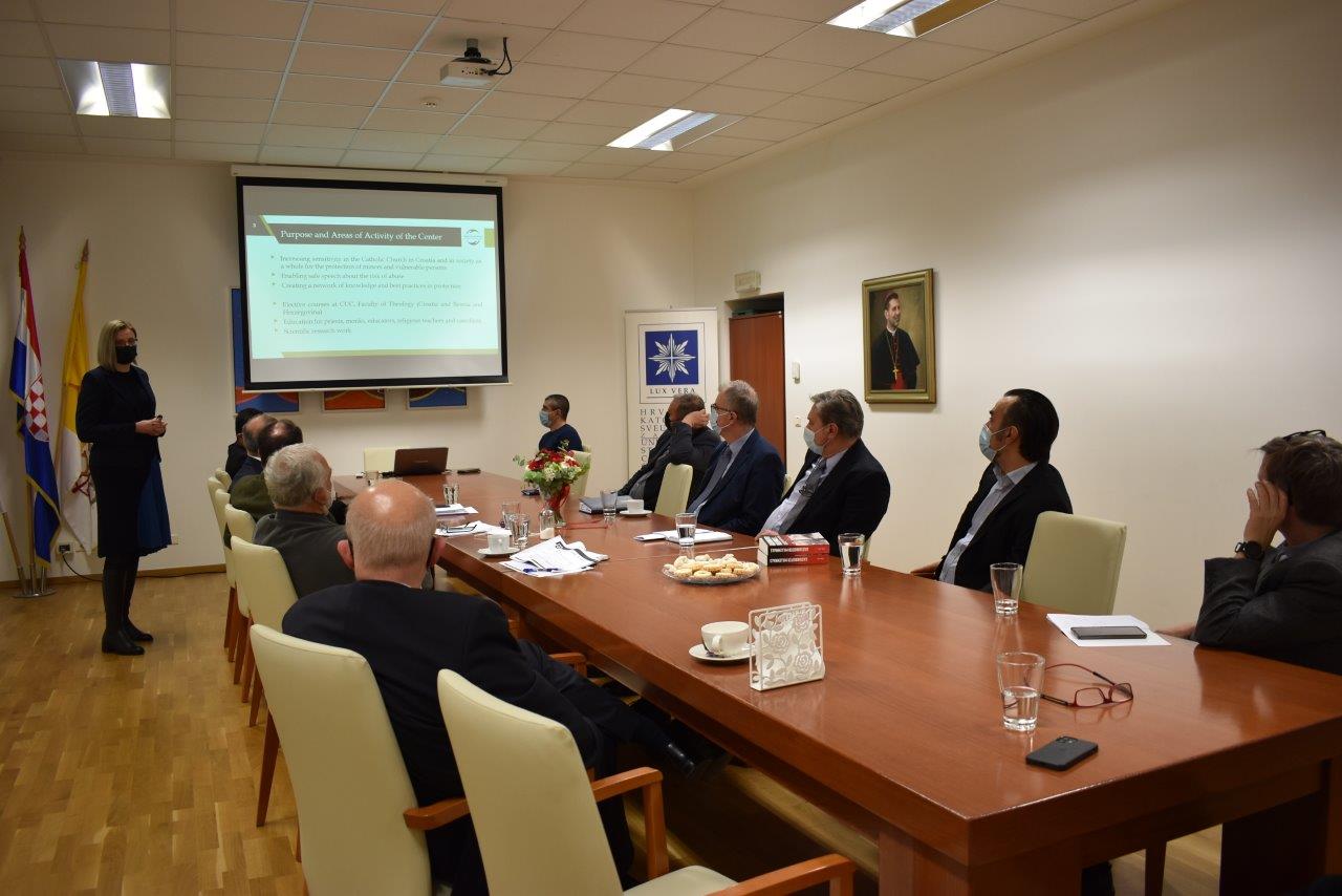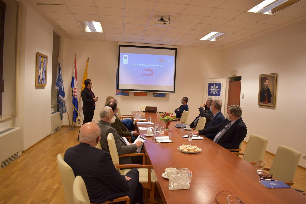 Nakon obilaska Kampusa, u Vijećnici Hrvatskog katoličkog sveučilišta susreli su se s voditeljem znanstveno-istraživačke jedinice Digit-HeaL doc. dr. sc. Antom Čartolovnim, voditeljicom Centra za promicanje dobrobiti ranjivih osoba mr. sc. Marinom Šijaković, znanstvenim suradnikom doc. dr. sc. Josipom Bošnjakovićem te doc. dr. sc. Tadom Jurićem s Odjela za povijest Hrvatskog katoličkog sveučilišta.