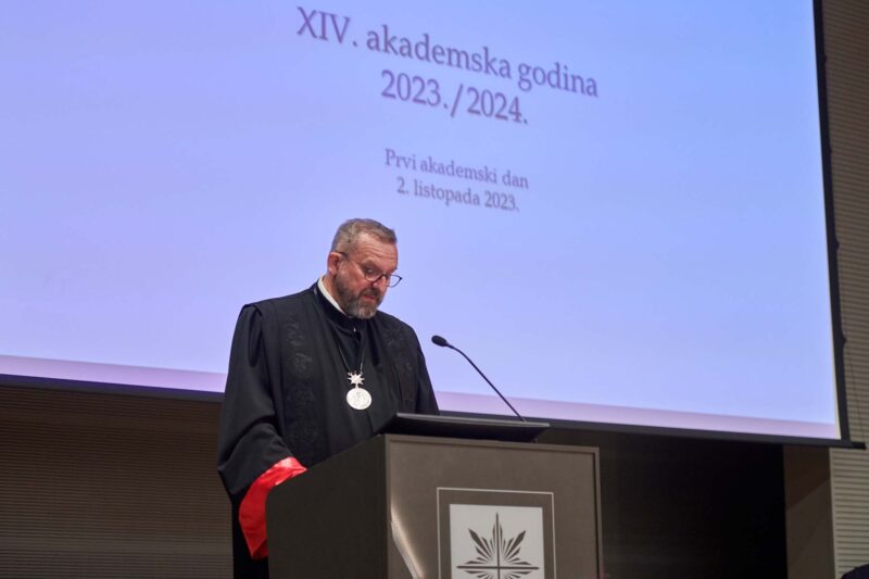 U ime čitave akademske zajednice Hrvatskog katoličkog sveučilišta sve okupljene pozdravio je prof. dr. sc. Željko Tanjić, rektor Hrvatskog katoličkog sveučilišta, zahvalivši im što su izabrali Hrvatsko katoličko sveučilište za mjesto svog studiranja. “U središte rada Hrvatskog katoličkog sveučilišta stavljamo naše studente i njihovo znanje, njihov studij, ali i odgojnu i duhovnu dimenziju koja je potrebna za njihovu svakodnevicu i za njihov budući život. Našim studentima želimo prenijeti poruku da je učenje i znanost bitna, ali da je sveučilište i prostor promišljanja, traženje puta razvoja cjelokupne osobe. Stoga su, osim nastave, u ponudi Sveučilišta mnoge aktivnosti, ali i ponuda Sveučilišne kapelanije. Naš sveučilišni kapelan velečasni Branimir brine za duhovni život i na raspolaganju vam je za vaš duhovni rast, kao i svi mi svećenici na Sveučilištu. Naš je cilj također ponuditi studentima izvrsnost. Izvrsnost se manifestira kroz naše studijske programe, odnos prema studentima, posvješćivanje primljenog znanja i njegove primjenjivosti u svakodnevnom životu… Odgojna i duhovna dimenzija, izvrsnost, male grupe, povezanost – sve je to dio naše unicathnosti po čemu se mi razlikujemo od drugih Sveučilišta. Želja nam je da do odgojne i obrazovne izvrsnosti dođemo zajedno. Zato, radujmo se zajedno rastu našeg Sveučilišta, novim programima, projektima i aktivnostima i neka nam je sretna i blagoslovljena ova 14. akademska godina na našem Sveučilištu!”, zaključio je rektor.